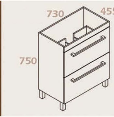 Indi 750 Free Standing 2 Drawers M Handles Soft close runner Dimensions: Width: 730mm Height: 750mm Depth: 455mm